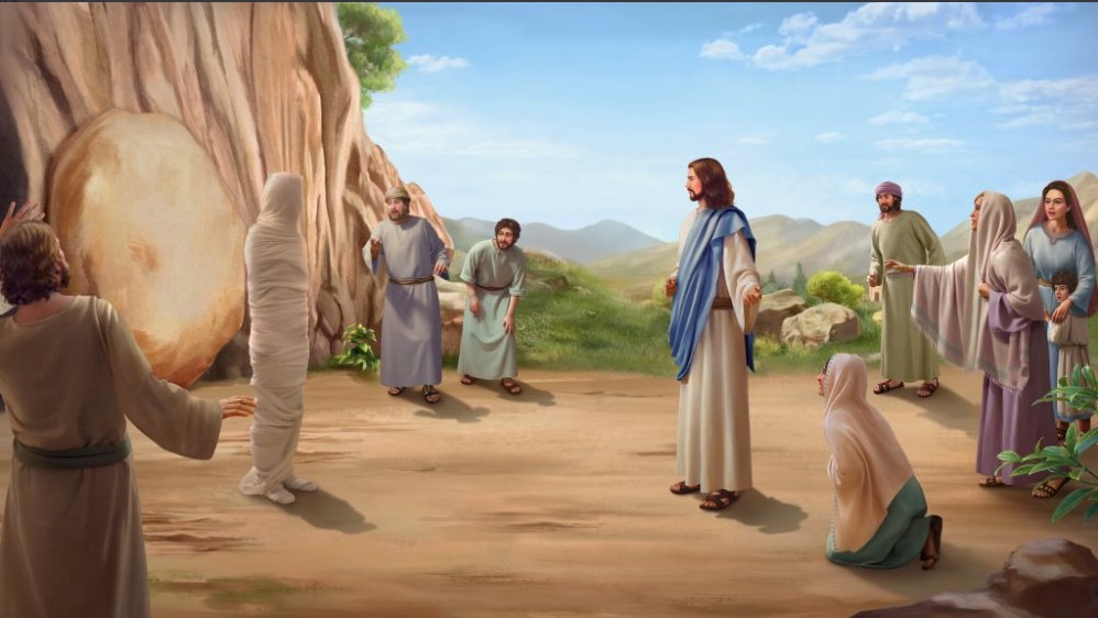 Ин 11: "39 Иисус говорит: уберите камень. Сестра умершего, Марфа, говорит Ему: Господи! уже разлагается; потому что четыре дня, как он в гробнице. 40 Иисус говорит ей: не сказал ли Я тебе, что, если будешь верить, увидишь славу Божью? 41 Итак убрали камень [от пещеры], где лежал умерший. Иисус же поднял глаза к небу и сказал: Отче! благодарю Тебя, что Ты услышал Меня. 42 Я и знал, что Ты всегда услышишь Меня; но сказал [это] для народа, стоящего здесь, чтобы поверили, что Ты послал Меня. 43 Сказав это, Он воскликнул громким голосом: Лазарь! иди вон. 44 И вышел умерший, обвитый по рукам и ногам погребальными пеленами, и лице его обвязано было платком. Иисус говорит им: развяжите его, пусть идет."