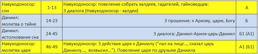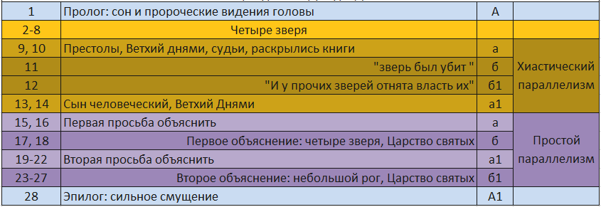 Обратите внимание, что пришествие Сына Человеческого на облаках (ст. 13, 14) согласно структуре текста является скорее всего продолжением сцены с Ветхим днями, престолами и книгами (ст. 9, 11) - соединяем разделы а и а1 в одну сцену.