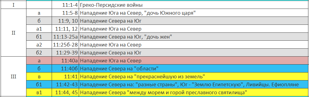 Этот раздел (см. картинку выше) построен по строгой структуре взаимных нападений Юга и Севера, а ключевые слова "Дочь Южного царя" и "Дочь жен" в соответсвующих раделах "а" и "а1" указывает на параллелизм событий.