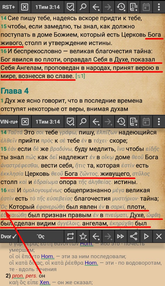 1Тим 3:15-16: "...Церковь Бога живого, столп и утверждение истины. И беспрекословно - великая благочестия тайна: Бог [в греч. ориг. - "Он", "Который"] явился во плоти, оправдал Себя в Духе, показал Себя Ангелам, проповедан в народах, принят верою в мире, вознесся во славе."
