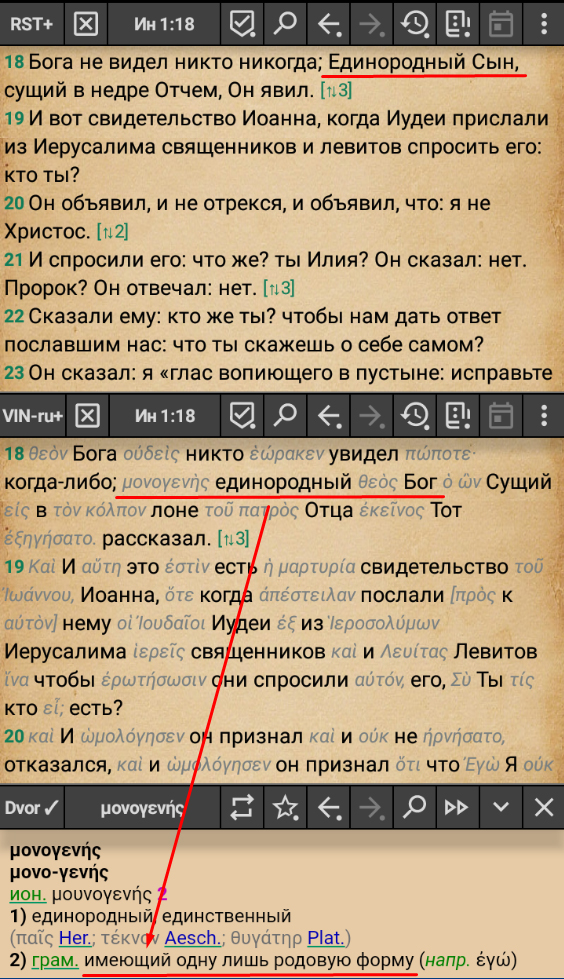 Мы склоняемся к мысли, что речь идет о Боге той же самой природы, что и Отец. Потому что Бог никогда буквально не рожал. Антитринитарии (противники учения о Троице) считают, что речь идет о сотворении первого ангела-Иисуса. Однако буквально "единородный" означает "единственный", а других таких же нет. А по их учению Иисус - не единственный сотворенный ангел...