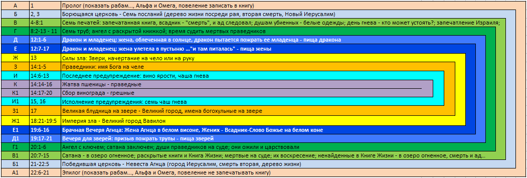 Человек, который писал Откровение наверняка не думал, что он пишет строго по структуре. А если знал, то сначала разработал план, с множеством переписываний и редакций (это при дороговизне тогдашней бумаги). Однако он не мог надеяться, что при такой насыщенности "видений" материалом кто-то разгребет эти "завалы", увидит его замысел, и оценит. Работа была безнадежна. Тогда непонятно зачем вообще это было написано - для себя? Денег это не принесет.