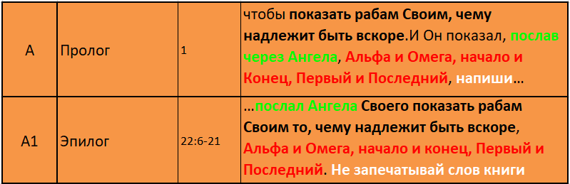 Разделы-блоки А и А1 параллельны тем, что содержат общую вступительную и заключительную информацию о получаемом Откровении: