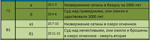 Так и тут - В1 и Г1 - мы видим суды над праведниками (20:4-6) и нечестивыми (20:11-15).