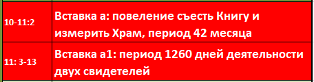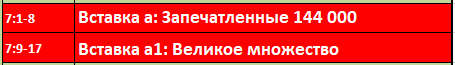 Эти блоки собраны строго по одной схеме: начинаются сценой из Небесного святилища - место присутствия Бога на небе. Далее следуют печати и трубы с информативной вставкой между 6 и 7 печатью/трубой. Эта вставка собрана тоже в виде пары параллельных подблоков, посвященных одной теме.