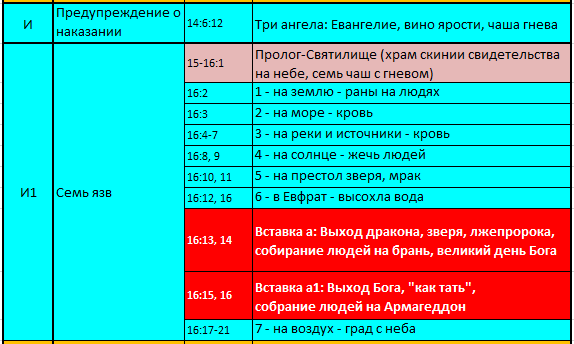 Блок И1 построен по схеме, точно как у Семи печатей и Труб: вначале сцена из Небесного святилища, а между последними язвами вставка из двух параллельных подблоков - а и а1.