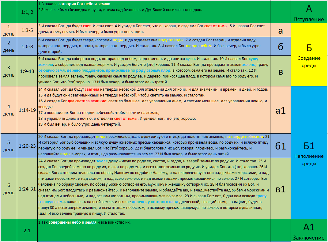События творения происходят по схеме обычного параллелизма. Сначала Бог за три дня последовательно творит среду или понятия, а за последующие три дня последовательно их наполняет.
