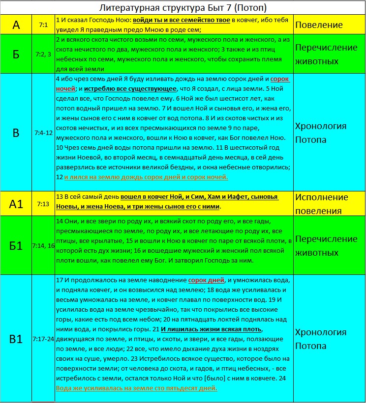 Описание Всемирного Потопа в Быт7 имеет параллельную структуру. Глава разбита на смысловые отрывки, которые посвящены одной теме. Они иногда повторяют смысл другими словами или символами. Последующие параллельные отрывки могут добавлять новую информацию.